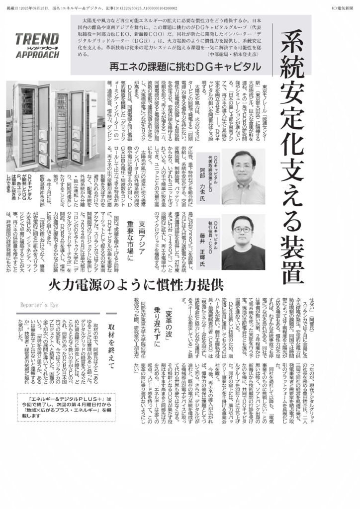 電気新聞に、系統安定化支える装置としてデジタルグリッドルータDGR記事が掲載されました。 | 株式会社DGキャピタルグループ | 傘下事業会社の経営、DGコンソーシアム運営、DG関連技術ファンド